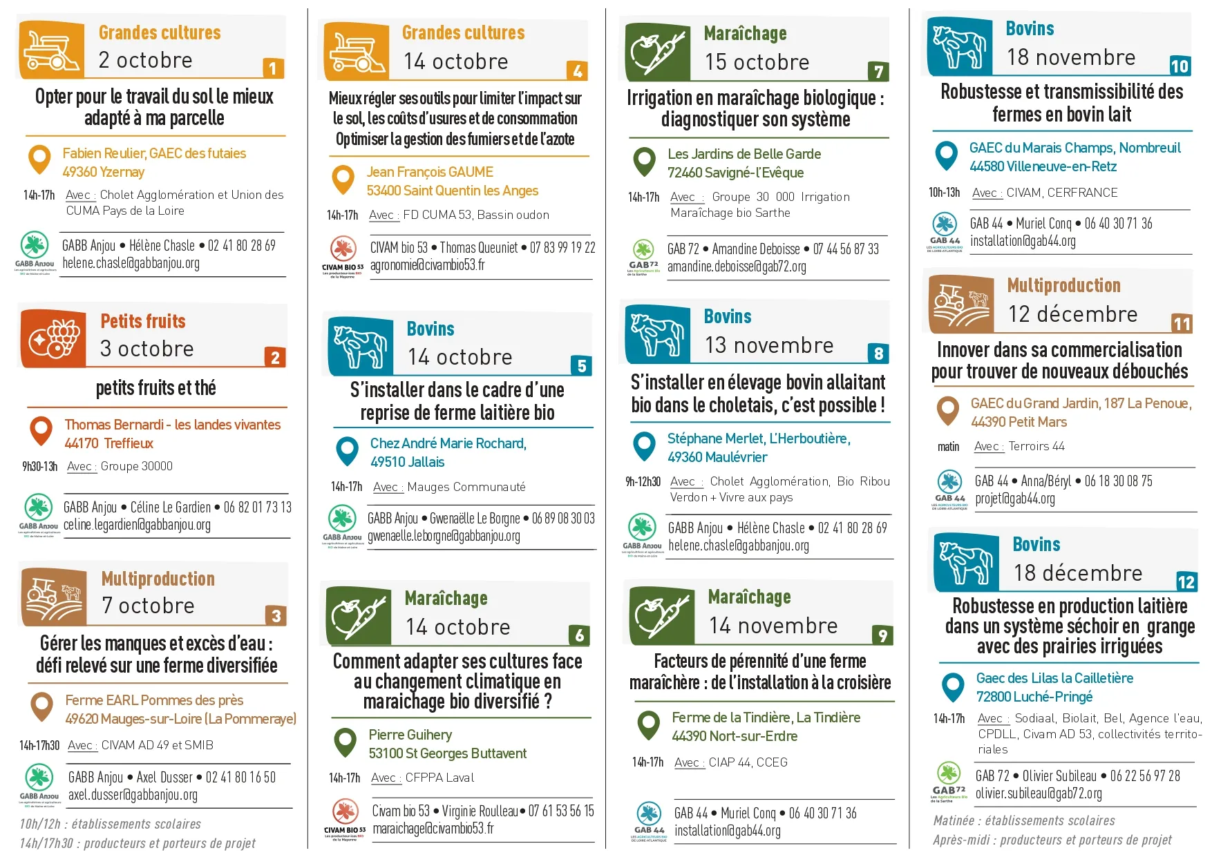 12 fermes ouvrent leur porte pour rencontrer des productrices et producteurs bio ou porteuses et porteurs de projet en élevage, en grandes cultures, en plantes médicinales et aromatiques et en fleurs comestibles. Ces fermes ouvertes permettent aussi de découvrir aux personnes en formation l’agriculture biologique.