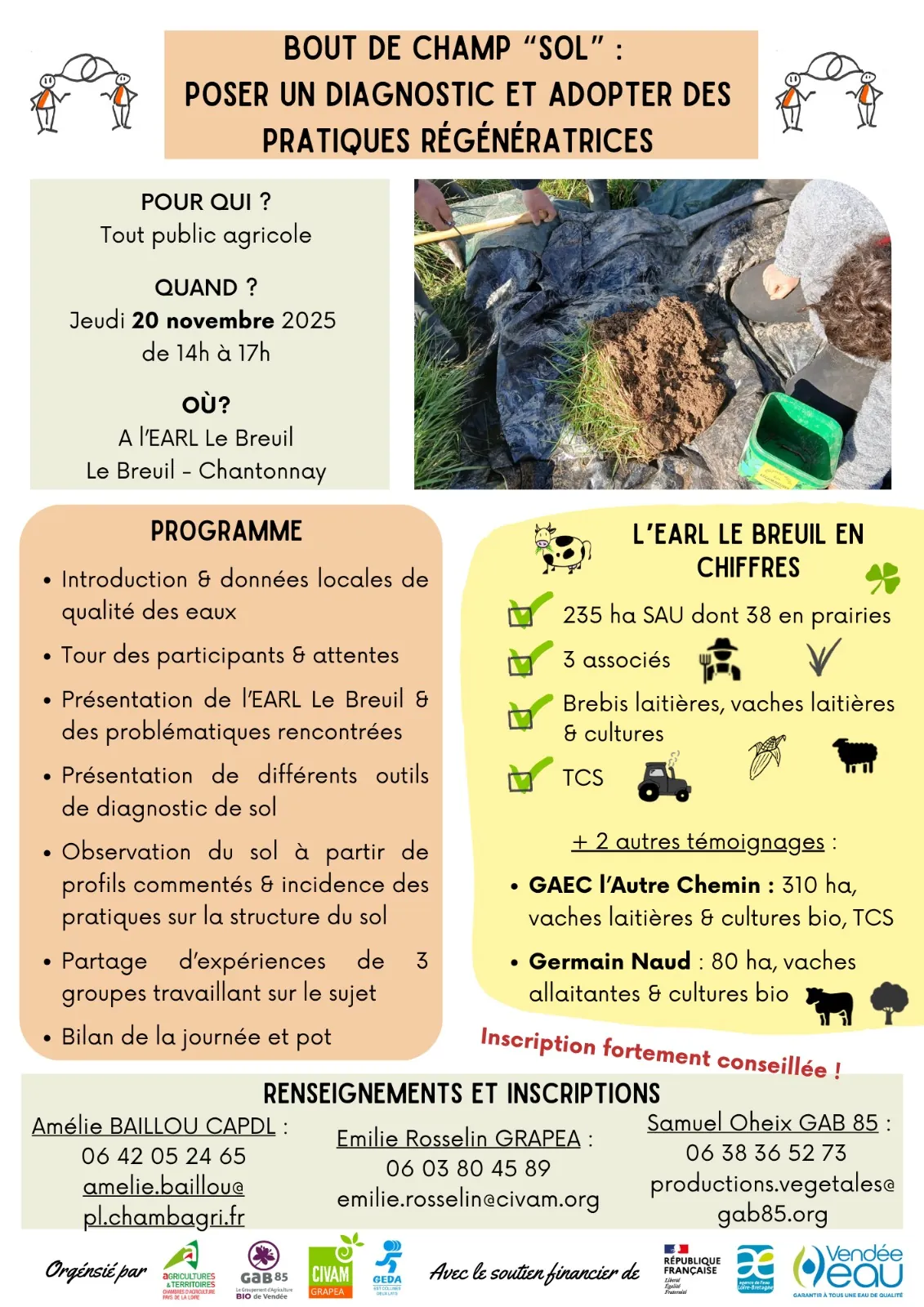 Vous souhaitez échanger autour des pratiques favorables à la vie du sol et à la qualité de l’eau => Venez participer le 20 novembre à notre journée Bout de champ « Sol », co-organisée par le GRAPEA, la CRA des Pays de la Loire et le GAB85 à l’EARL le Breuil (Chantonnay) (en partenariat avec Vendée Eau).